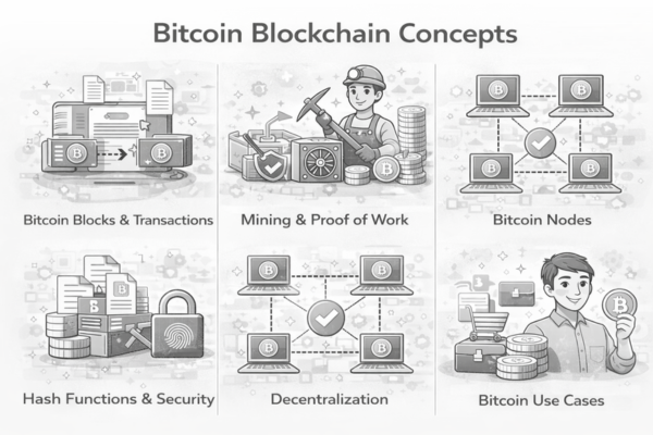 This guide explains key concepts such as Bitcoin blocks, transactions, mining, nodes, hash functions, and decentralization in a clear, step-by-step manner. You will learn how the Bitcoin blockchain prevents fraud, double spending, and hacking while operating without a central authority like a bank or government.