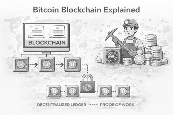Bitcoin blockchain explained in simple words for beginners who want to understand how Bitcoin works behind the scenes. The Bitcoin blockchain is a decentralized digital ledger that records all Bitcoin transactions securely and transparently across a global network of computers. Each transaction is grouped into blocks, verified by miners, and permanently added to the blockchain using cryptographic security and proof of work.